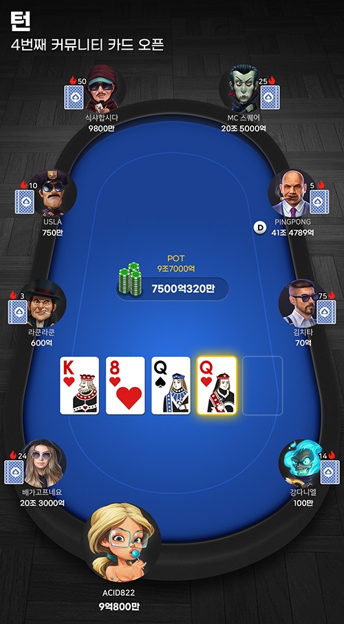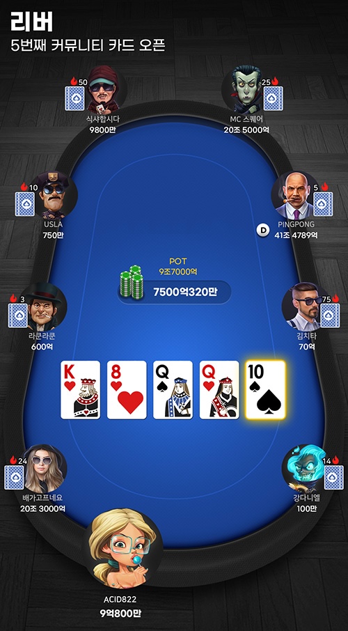 ํ๋ ์ดํ ํฌ์คํธ ํ๋์ผ๋ก ์งํ๋๋ฉฐ, ํ๋ ์ด์ด๋ 3์ฅ์ ์ปค๋ฎค๋ํฐ ์นด๋๊ฐ ์์ ์ ํธ๋ ์นด๋์ ์ด๋ค ์กฐํฉ์ด ๋์๋์ง์ ๋ฐ๋ผ ์ฒดํฌ, ๋ฒ ํ , ์ฝ, ํด๋ ๋๋ ๋ ์ด์ฆ๋ฅผ ํ ์ ์์ต๋๋ค.